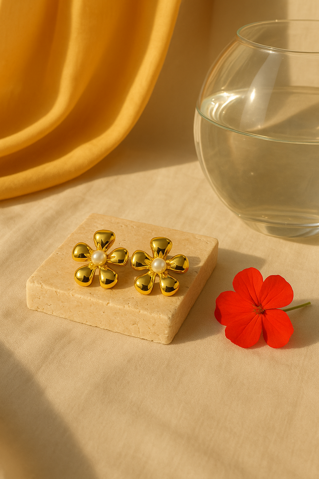 Elevate your everyday style with the Bloom Pearl Earrings, designed in a delicate floral silhouette with a luminous pearl at the center. Crafted in high-quality stainless steel with a radiant gold finish, these earrings are lightweight, anti-tarnish, and perfect for daily and office wear. Their timeless petal-inspired design adds a touch of elegance and charm, making them an effortless choice for both casual and professional looks.