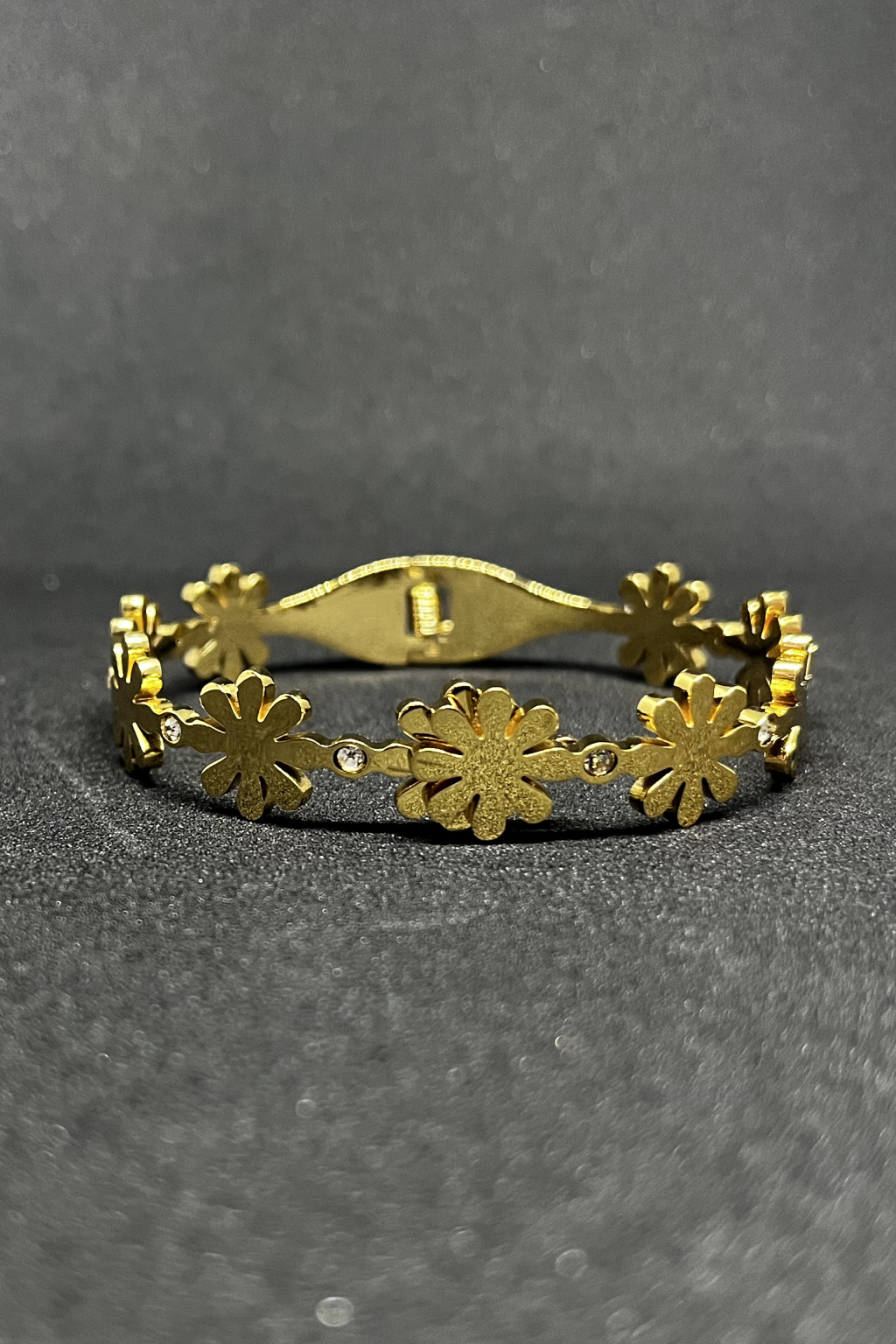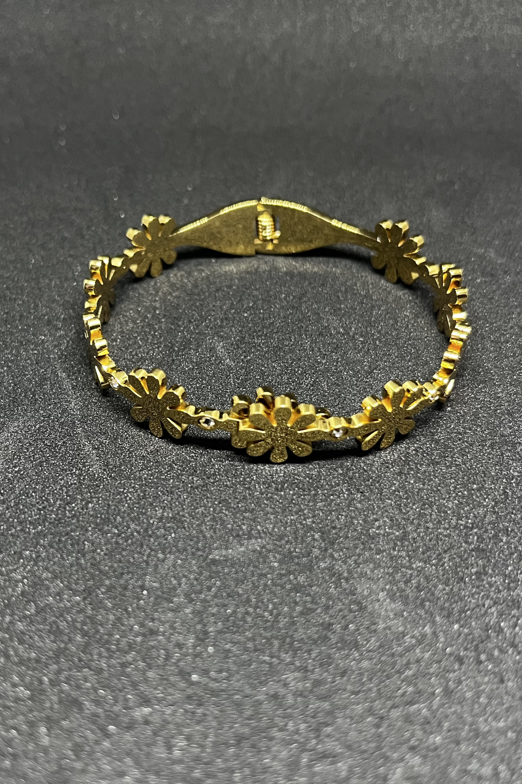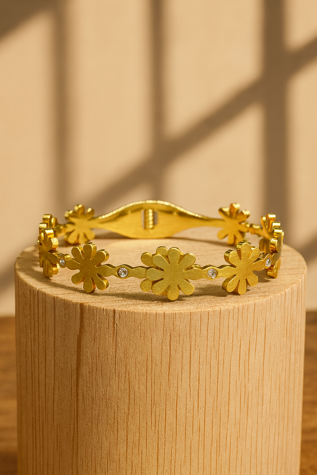 Embrace timeless elegance with the Eternal Flower Bracelet, crafted from high-quality stainless steel with a radiant gold finish that resists tarnishing. At its center, a delicately set Zircona American Diamond shines brilliantly, adding a touch of luxury and sparkle. Lightweight yet durable, this bracelet is perfect for office wear, casual outings, or adding a subtle charm to everyday style. A graceful blend of sophistication and comfort, it’s a must-have for your jewelry collection.