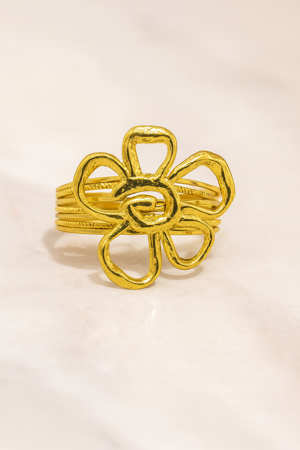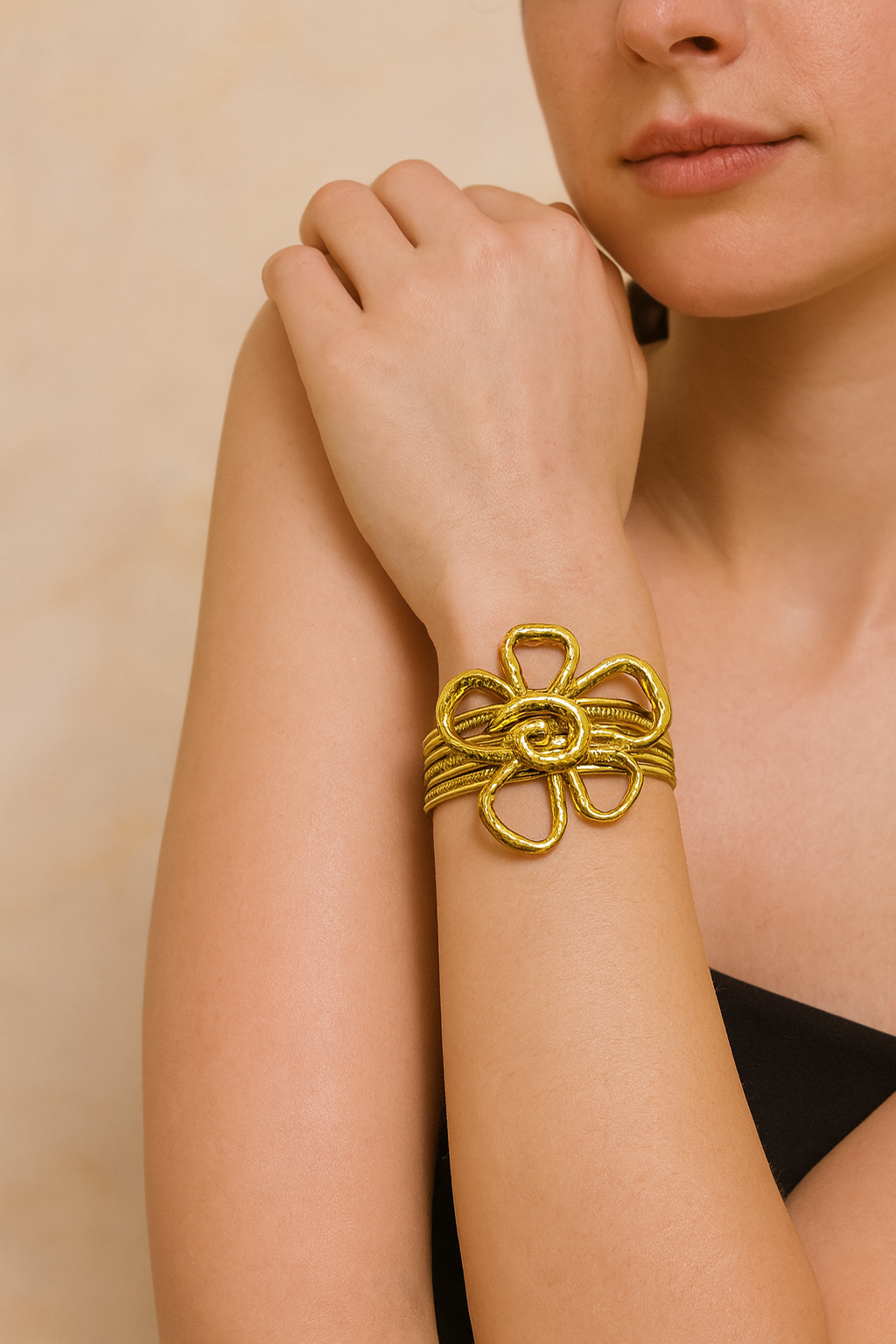 Inspired by nature’s bloom, the Floral Radiance Cuff Bracelet captures the charm of a flower in a contemporary cuff design. Made with stainless steel and finished in anti-tarnish gold, it’s lightweight, durable, and effortlessly stylish—perfect for those who love jewelry that speaks of beauty and resilience.
