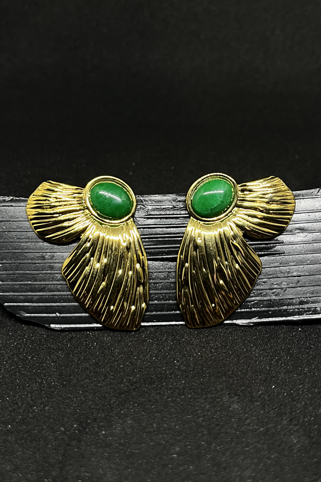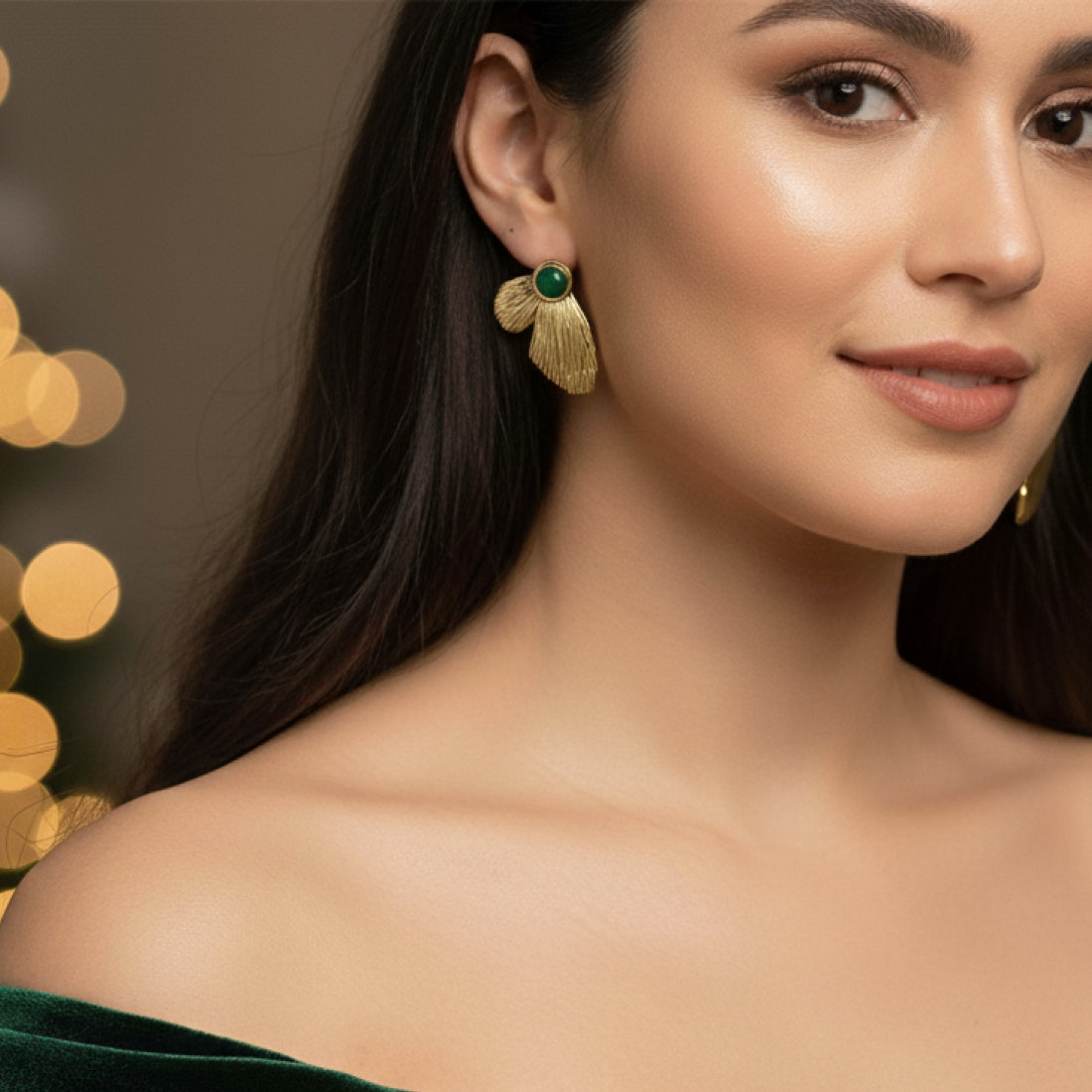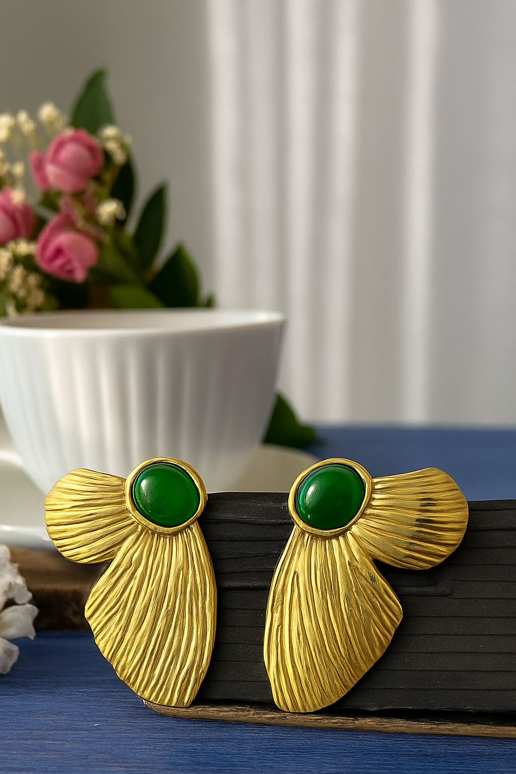Elevate your elegance with the Emerald Whisper Wings Earrings, crafted from premium stainless steel with a radiant gold finish that resists tarnish. At the heart of each wing rests a striking green stone, securely bonded to ensure lasting brilliance. Designed for versatility, these earrings bring a graceful charm to office casuals, intimate dates, or small celebrations. Their butterfly-inspired silhouette adds a touch of sophistication, making them the perfect blend of everyday wear and special occasion style.