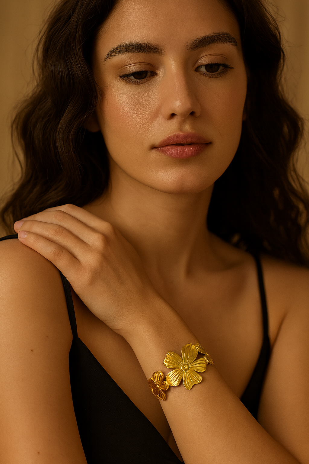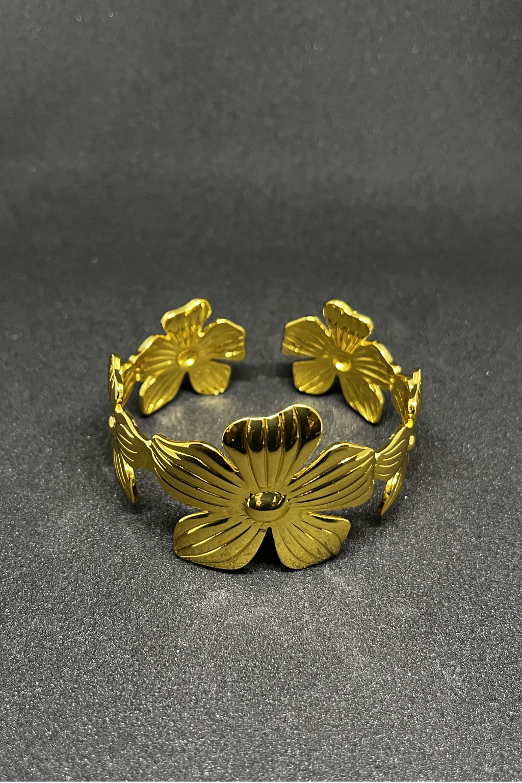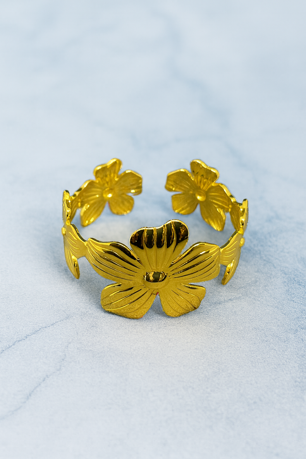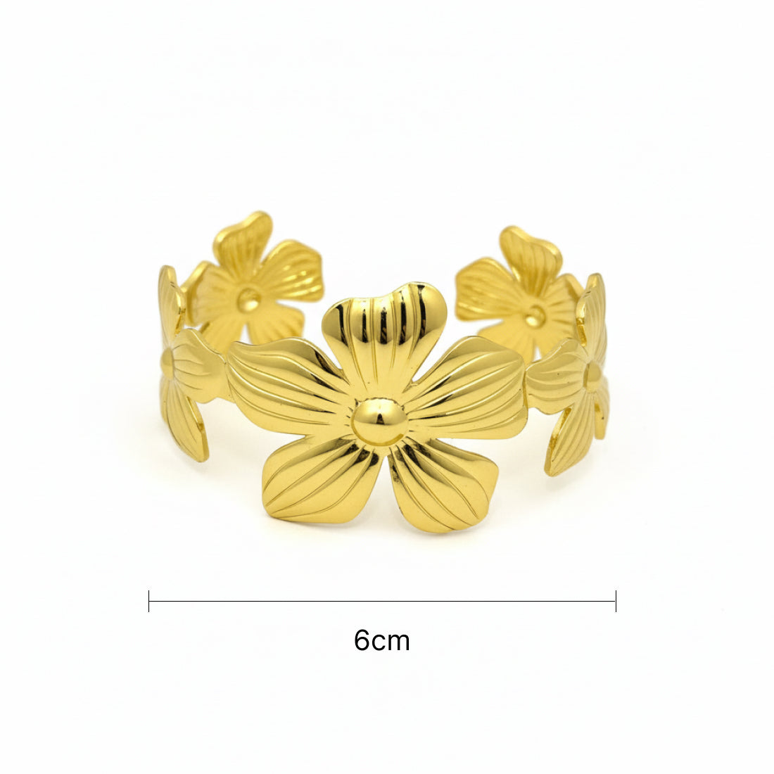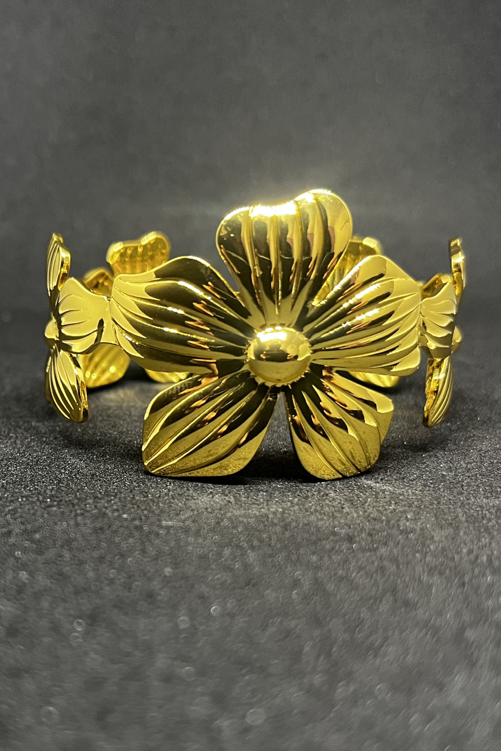 Elevate your style with this Flower Petal Gold Bracelet Cuff, a timeless piece crafted from high-quality stainless steel with a radiant gold finish. Designed to resist tarnishing, this cuff combines durability with elegance. Its delicate floral motif adds a touch of nature-inspired beauty, making it perfect for both everyday wear and special occasions. Lightweight yet sturdy, it’s a versatile accessory that pairs seamlessly with any outfit, from casual chic to evening glam.