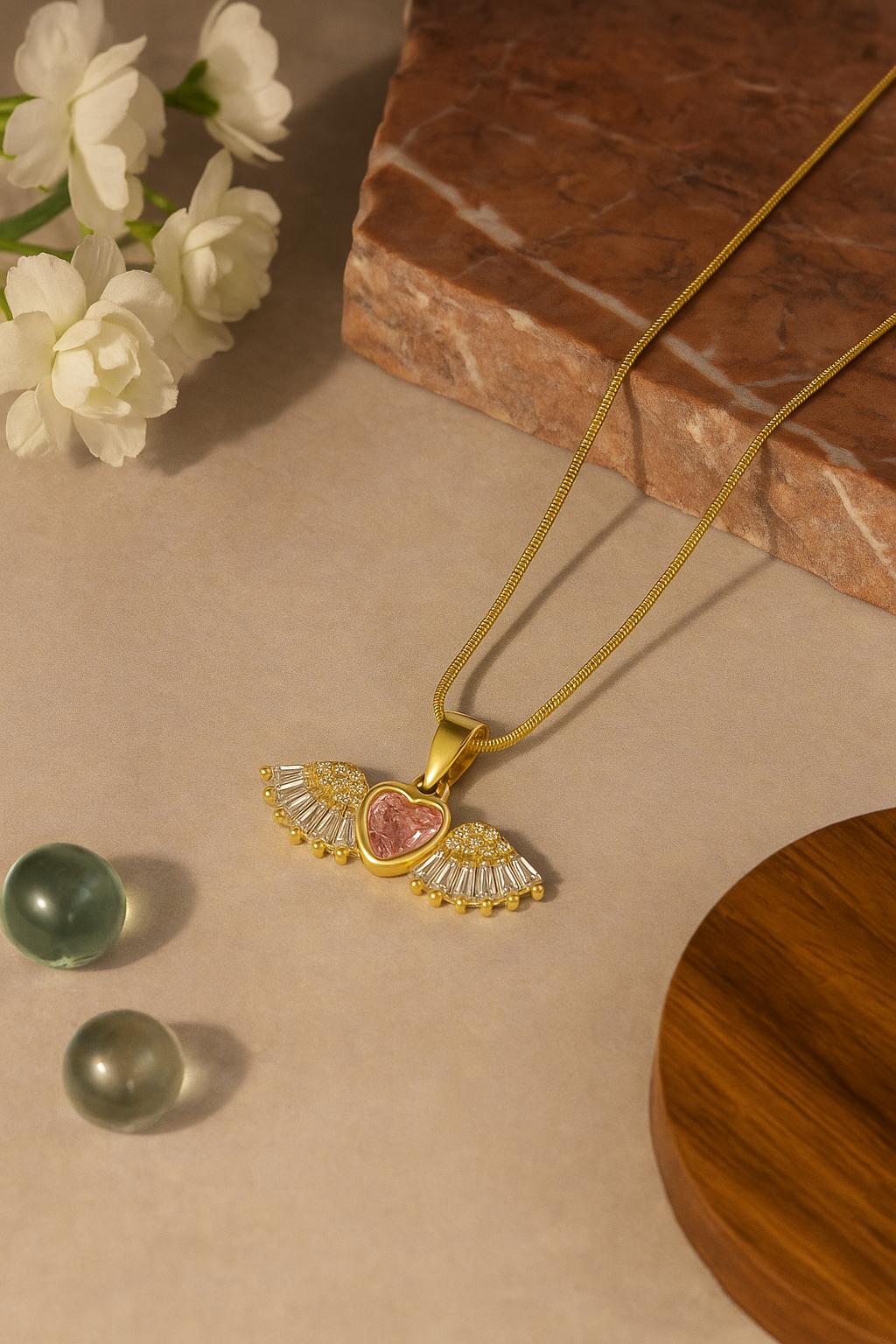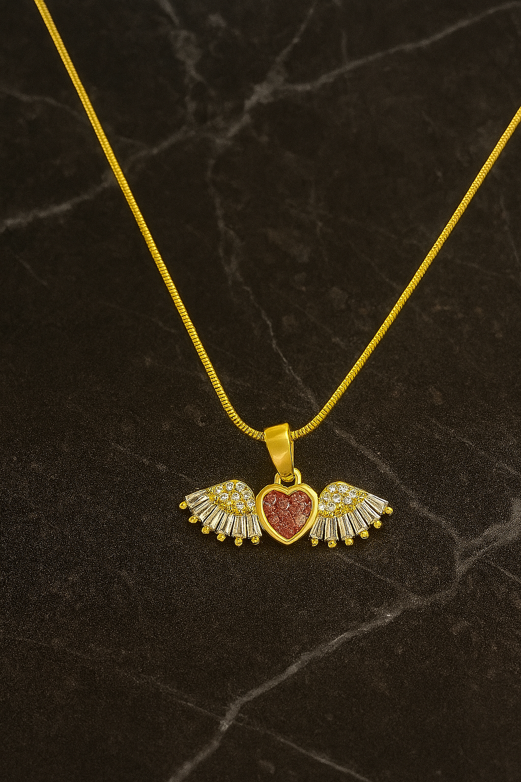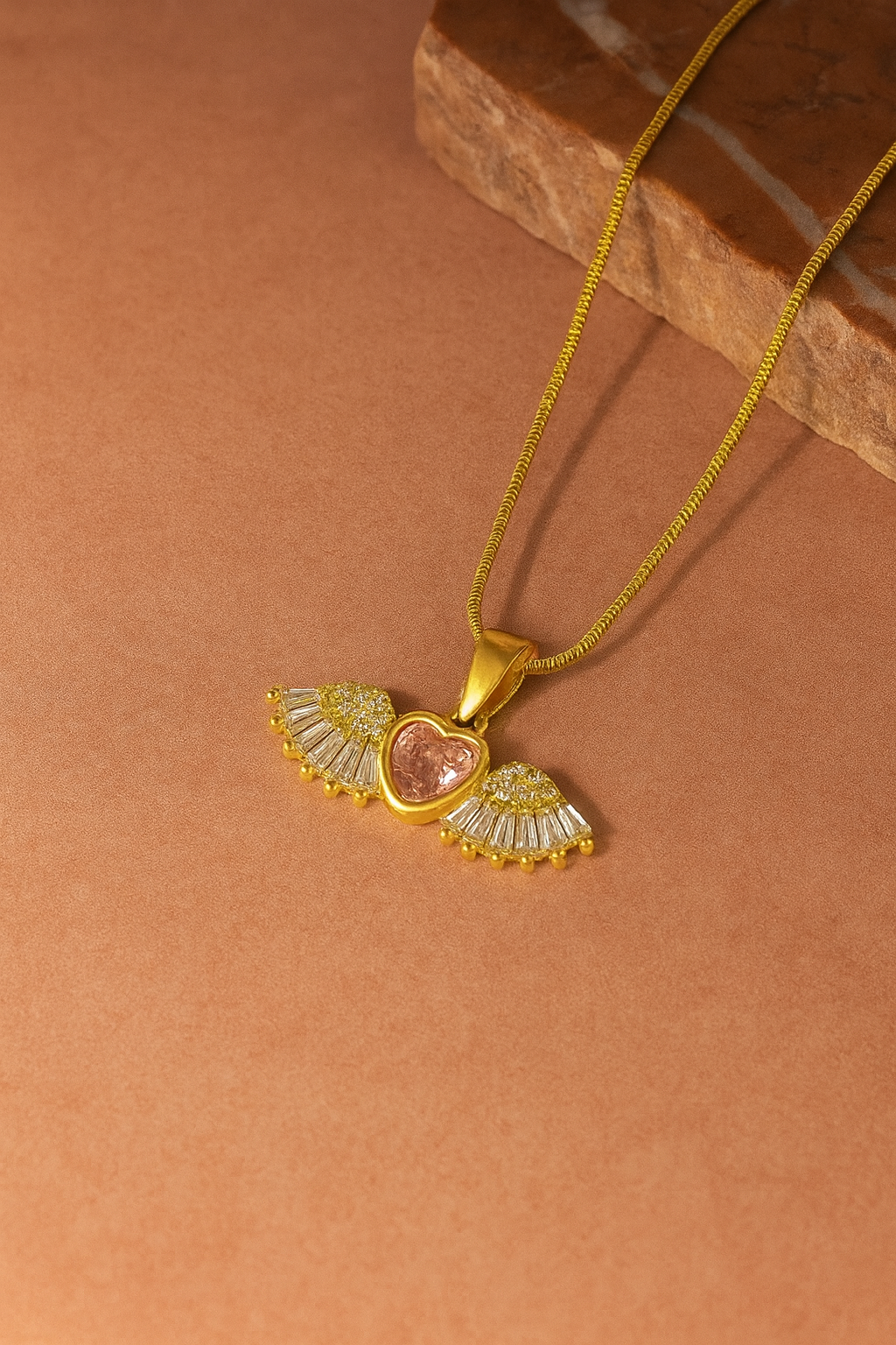 Grace meets elegance with our Eterna Wings Pendant and Chain, crafted in premium anti-tarnish gold polish for long-lasting shine. The centerpiece features a sparkling heart framed with delicate zirconia and angel-inspired wings, symbolizing love, protection, and timeless beauty. Lightweight yet striking, this piece is perfect for daily wear or special occasions, adding a radiant touch to any outfit.