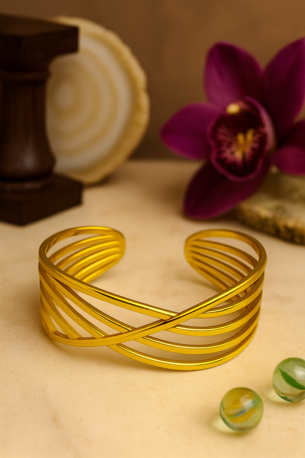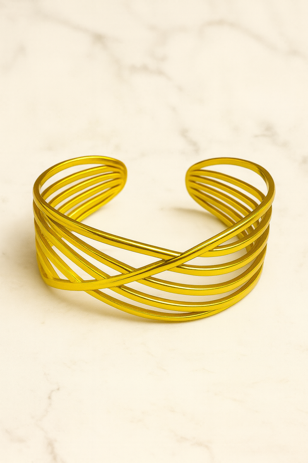 Elevate your style with the Aurora Cuff, a sleek anti-tarnish gold-polished bracelet. Designed with layered overlapping bands that form a graceful X-shape, it blends modern sophistication with timeless charm. Perfect for both casual wear and evening elegance.