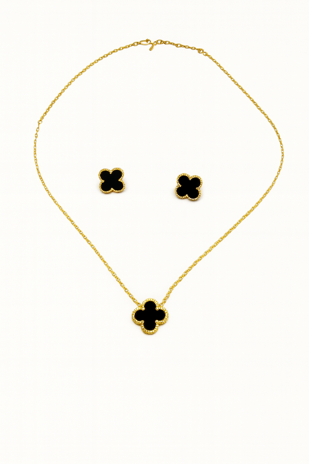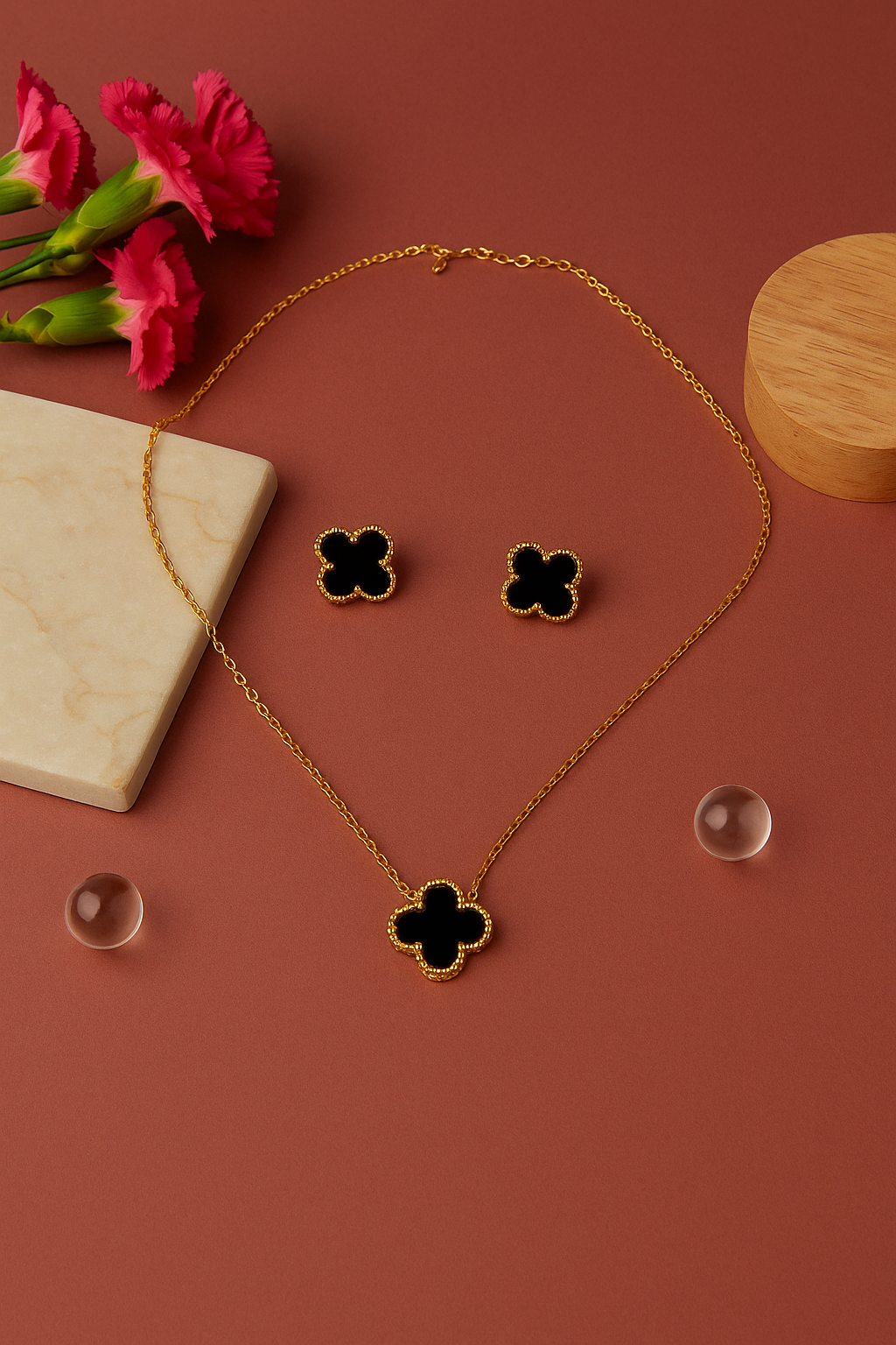 "Elevate your elegance with the Black Clover pendant & earring Set, a timeless blend of sophistication and charm. Featuring a lustrous gold chain with a bold black onyx clover pendant and matching stud earrings, this set is designed to capture attention. The delicate beaded gold border enhances the richness of the design, while the deep black center symbolizes strength and grace. Perfect for both everyday wear and special occasions, this set adds a touch of refined luxury to any outfit.