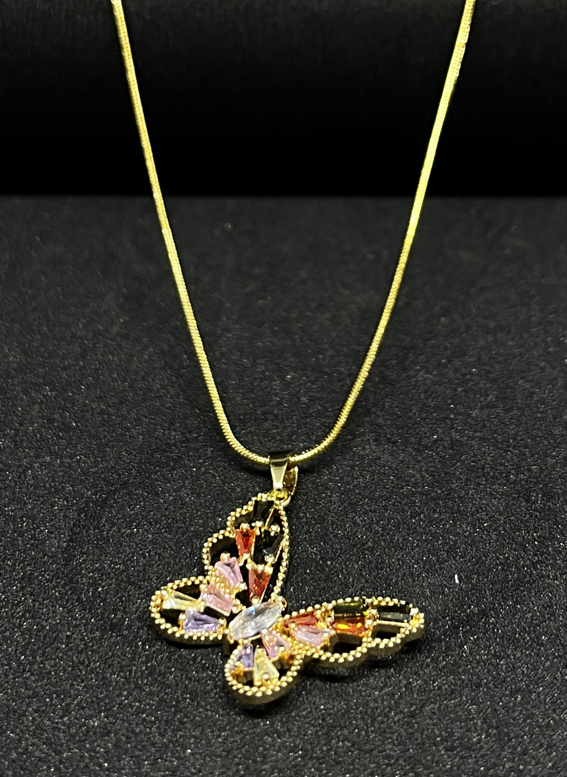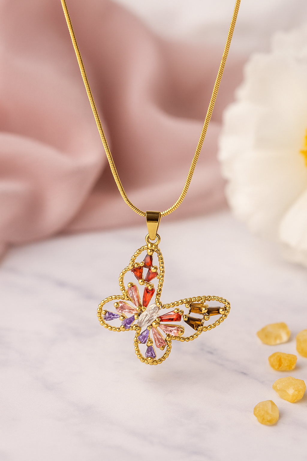 Elevate your everyday style with the Tricolor Zirconia Butterfly Necklace. Crafted in stainless steel with a radiant gold finish, this elegant piece is designed for daily and office casual wear. The butterfly pendant sparkles with three-color American diamond zirconia stones, adding a touch of vibrance and sophistication. With its anti-tarnish properties, this necklace promises long-lasting shine and effortless elegance, making it a versatile addition to your jewelry collection